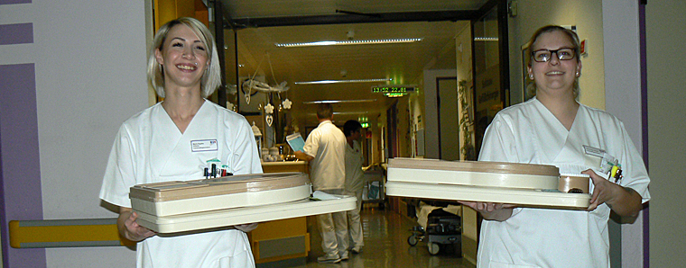 Gut gelaunt und strahlend: Marie-Sophie und Anna-Lena teilen das Essen aus auf der Station 3 des Alsfelder Krankenhauses. Die haben die beiden jungen Frauen gemeinsam mit ihren Mitschülern eigenverantwortlich geleitet. Ihr Fazit fällt eindeutig aus: Das war eine richtig gute Sache! Foto: Sabine Galle-Schäfer