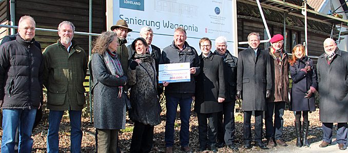 Die Begeisterung der Gäste brach sich nach dem Durchstreifen der Waggonia bei der Scheckübergabe durch Hans Dohm (Stiftung Denkmalschutz) und Holger Petri (Lotto Hessen) im warmen Wiesenhaus noch einmal Bahn: Von allen gab es herzlichen Dank an die Macherinnen Ursula Grupp, Geschäftsführerin der Loheland-Stiftung, und Elisabeth Mollenhauer-Klüber, die sich ihrerseits über das Lob und die Spende freuten. Erster Kreisbeigeordneter Frederik Schmitt bezeichnete das Kulturdenkmal Waggonia als das Herz Lohelands, das auch den Mut der Pionierinnen dieser Frauenbewegung verkörpere. „Wir stehen heute noch auf den Schultern dieser mutigen Frauen. Ohne sie wären viele Schritte in der Gleichberechtigung so wohl nicht möglich gewesen“, sagte er.