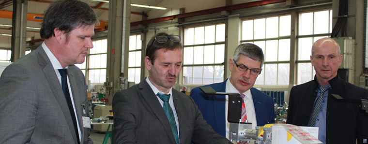 Landrat Manfred Görig (Zweiter von rechts) und Bürgermeister Matthias Weitzel (links) folgen mit großem Interesse den Erläuterungen von FFT-Geschäftsführer Manfred Hahl. Rechts im Bild Werner Lotz, Bereichsleiter Luftfahrt bei FFT. Foto: Erich Ruhl-Bady