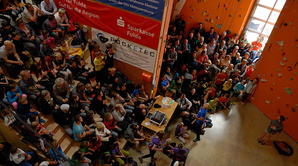 Der Tag der offenen Tür startete am Vormittag mit einer Vereinsrallye, bei der die Besucher an verschiedenen Mitmach-Stationen den Alpenverein und seine Angebote kennen lernen und gleichzeitig selbst ausprobieren konnten. Die dazugehörige Laufkarte war auch der Teilnahmeschein für eine Verlosung am Nachmittag, bei der attraktive Preise rund um den Outdoorsport winkten. Als besonderer Programmpunkt erwartete die Besucher um 14 Uhr die offizielle Eröffnung der neuen Außenboulderwand. In Anwesenheit der Bürgermeister von Petersberg und Fulda, Karl-Josef Schwiddessen und Dag Wehner, sowie dem Vorsitzenden des Sportkreises Fulda-Hünfeld, Martin Schäfer, wurde die 75m² große Wand mit ihren 36 Boulderrouten den Kletterern übergeben. Und da Bouldern – mit Matten gesichertes Klettern in einer Höhe von bis zu vier Metern – derzeit im Trend liegt, zögerten die Besucher nicht lange und nahmen die neuen Routen der Außenwand zahlreich „in ihre Hände“.