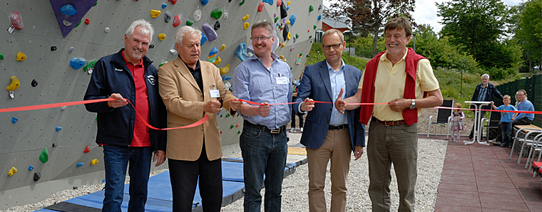 Offizielle Einweihung der neuen Außenboulderwand mit Martin Schäfer (Vorsitzender des Sportkreises Fulda-Hünfeld), Norbert Weber (Ehrenvorsitzender der DAV-Sektion Fulda), Michael Rutkowski (1. Vorsitzender der DAV-Sektion Fulda), Dag Wehner (Bürgermeister der Stadt Fulda und Sportdezernent) und Karl-Josef Schwiddessen (Bürgermeister der Gemeinde Petersberg).