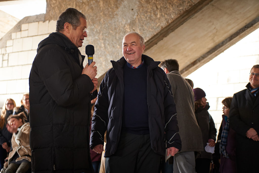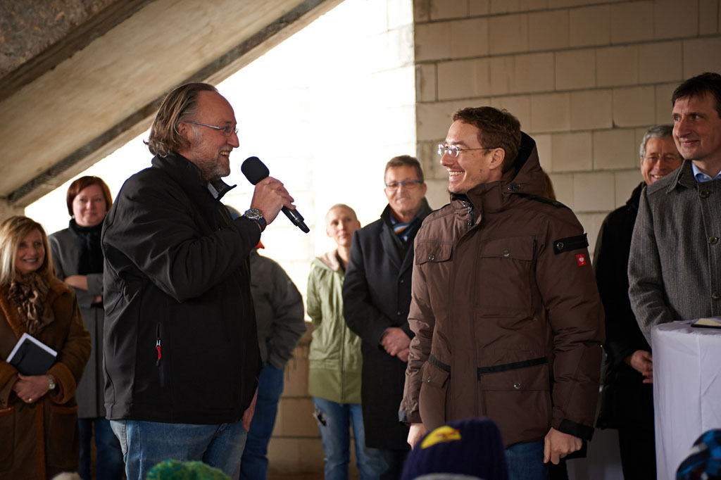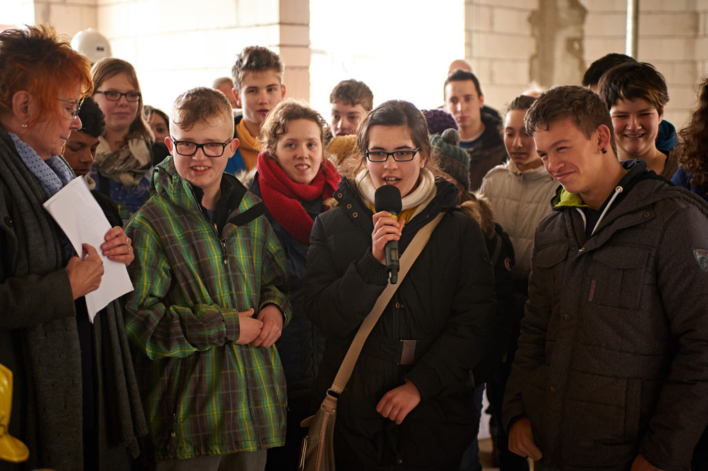 Norbert Strauss erklärte, dass er durch Dr. Alois Rhiel zu dieser Unterstützung angestiftet wurde und sich nun freue, gemeinsam mit den Kindern die Fortschritte dieses Baus zu besichtigen. Auch Rhiel dankte der Familie Strauss für ihr Engagement. „Wir sehen hier Menschen, die mehr tun, als es ihre Pflicht ist. Es geht hier nicht um einen Scheck, sondern um den Austausch und die Begegnung von Schülern mit und ohne Behinderung.“