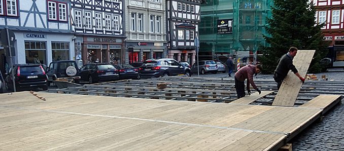 Am Dienstag herrschte reger Betrieb auf dem Alsfelder Marktplatz. Nicht nur der diesjährige Weihnachtsbaum wurde von den Mitarbeitern des Städtischen Baubetriebshof aufgestellt, auch der Aufbau der Eisbahn hat begonnen. Eine elf Meter hohe Nordmann-Tanne wird in diesem Jahr den Marktplatz zieren. Der Baum stammt in diesem Jahr von einem Spender von der Altenburg und wird in den nächsten Wochen noch geschmückt. Ein weiteres Highlight in diesem Jahr ist die Eisbahn, die vom 26. November bis zum 13. Januar auf dem Marktplatz zum Schlittschuhlaufen oder Eisstockschießen einlädt. Unter dem Motto „Alsfeld on Ice“ werden auch viele Events veranstaltet wie Eisdiscos oder After Work Hütt’n Gaudis. Die offizielle Eröffnung findet dann am Samstag, 1. Dezember ab 14 Uhr statt. Dort wird neben Bürgermeister Stephan Paule auch der zweimalige Eiskunstlauf-Europameister Norbert Schramm dabei sein. +++