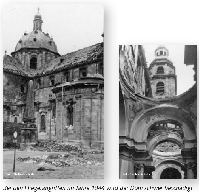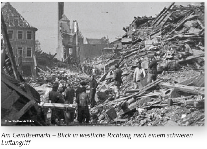 Ab Mitte 1944 sind die Stadt Fulda und die umliegenden Landkreise heftigen Bombardements ausgesetzt. In Fulda fallen insgesamt 1.594 Menschen den Luftangriffen zum Opfer. Im Landkreis sind fast 100 Todesopfer zu beklagen. Die Sachschäden in der Stadt sind erheblich.