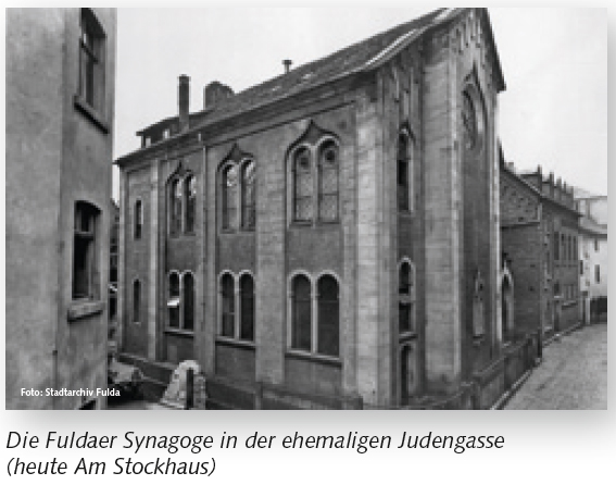 Am 9. November 1938 und in der darauffolgenden Nacht wird die Fuldaer Synagoge durch Vandalismus und mehrere Brandlegungen zerstört. Auch in Hünfeld, Burghaun, Rhina, Wehrda und Eiterfeld gehen die Synagogen in Flammen auf. In Gersfeld, Neuhof, Wüstensachsen und Tann werden die jüdischen Gotteshäuser vollständig zertrümmert.