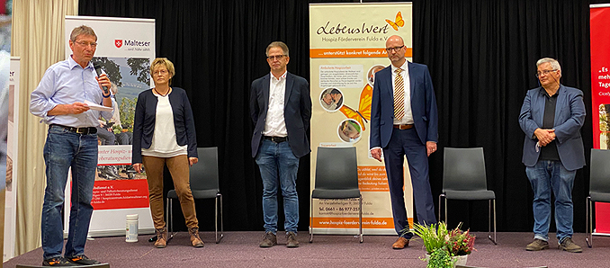 Michael Brand, Vorsitzender des Hospiz-Fördervereins und seine Stellvertreterin Silvia Hillenbrand erläuterten das Ziel dieser Veranstaltung. Man wolle das große Netzwerk der hospizlichen und palliativen Betreuung vorstellen. Damit kann den Betroffenen und ihren Angehörigen geholfen werden, um eine entlastende, würdevolle und einfühlsame Begleitung von Schwerstkranken und Sterbenden zu ermöglichen. Dies diene der Information und Aufklärung, deren Zielsetzung der Hospiz-Förderverein habe. Nach dem Motto: „Wir lassen die Menschen nicht alleine“ berichteten Wilfried Wanjek vom Ambulanten Hospizdienst der Malteser, Dr. Peter Fehrenbach von der medizinischen Versorgung durch das PalliativNetz Osthessen, Dr. Sebastian Schiel von der Palliativstation im Klinikum Fulda und Dagmar Pfeffermann vom stationären Hospiz St. Elisabeth in Fulda. Die Geschichten der Hinterbliebenen und deren oft sehr intimen Erlebnisse waren sehr individuell, und doch waren sie im Ergebnis vergleichbar. Alle stellten die Hilfen, die sie erfahren hatten, dankbar in den Fokus. Hilfen, die bei einem Betroffenen, der seinen Tod selbst bestimmen wollte, dazu führte, dass er in der Palliativstation den Suizidgedanken nicht weiter verfolgte, weil der durch eine selbst zu bestimmende Schmerzfreiheit „noch mal leben konnte, vor seinem natürlichen Tod“.