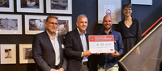 Jürgen Zebisch und Martin Vestweber (beide Deutsche Herzstiftung) überreichen Ingmar Süß und Angela Zentgraf (beide Kinder-Akademie) den Zuwendungsbescheid über 50.000 Euro. Foto: privat