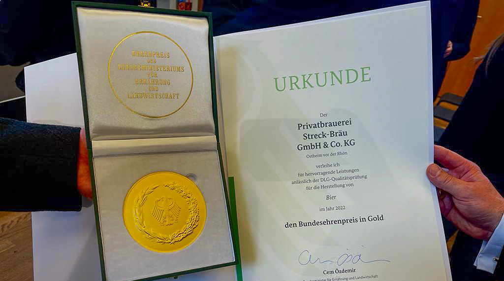 Tolle Neuigkeiten für das Strecks Brauhaus aus Ostheim v. d. Rhön. Am vergangenen Dienstag erhielt das Strecks Brauhaus in Berlin den Goldenen Bundesehrenpreis aus den Händen der Staatssekretärin Frau Dr. Rottmann in Vertretung des Landwirtschaftsministers, Cem Özdemir. Bei der feierlichen Zeremonie in den Räumen der Landesvertretung des Saarlandes waren das Who-is-who der Deutschen Brauwirtschaft anwesend: Die Hallertauer Hopfenkönigin Theresa Hagl, Holger Eichele vom Deutschen Brauer Bund, Adolf Schapfl vom Verband Deutscher Hopfenpflanzer e.V., der Vizepräsident der DLG (Deutsche Landwirtschafts-Gesellschaft) Dietrich Harms und viele andere bekannte Namen aus der Politik und Brauwirtschaft.