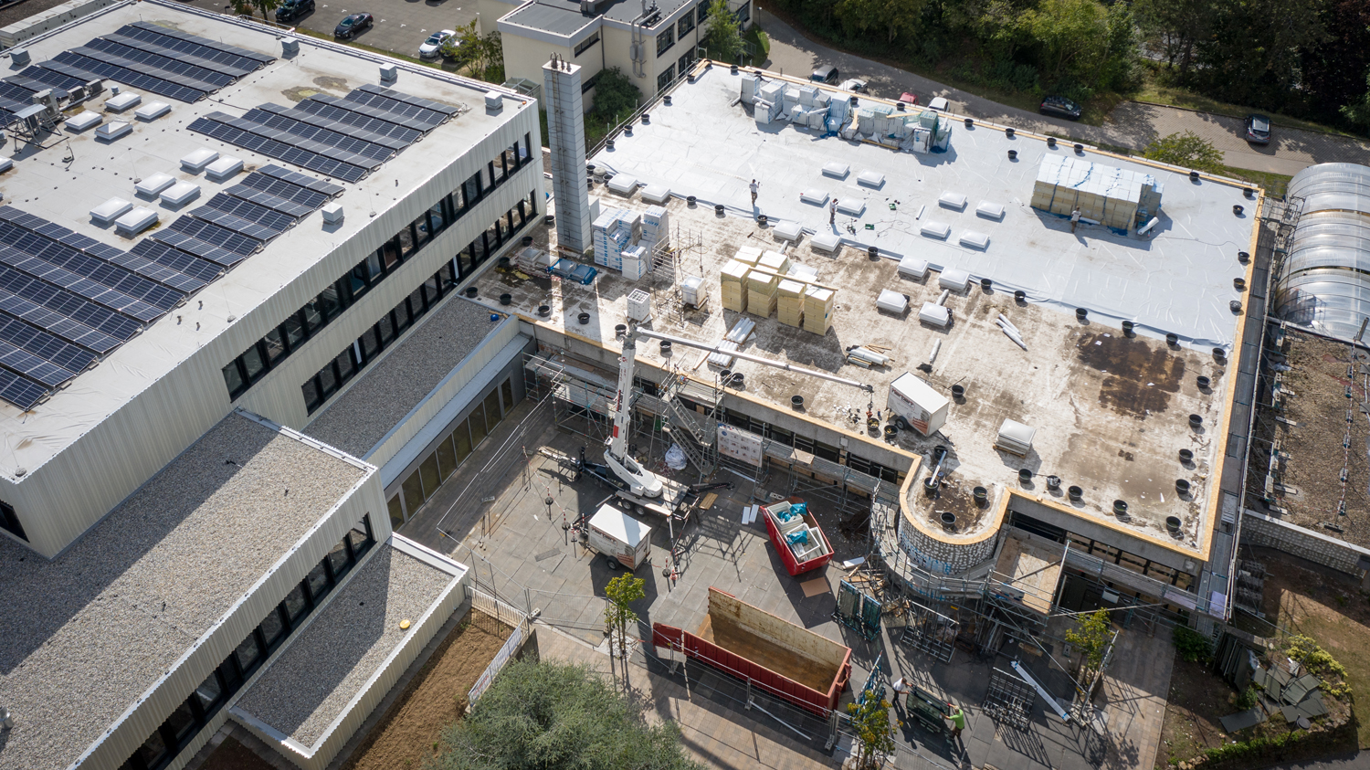 Erbaut wurde die Eduard-Stieler-Schule im Jahr 1972, zwei Jahre später zogen die Schülerinnen und Schüler in das Gebäude. „Zwar wurden immer mal wieder Anpassungsarbeiten durchgeführt, energetisch war die Schule jedoch nicht auf dem neusten Stand“, erläutert Markus Reichel aus dem Fachdienst Gebäudemanagement des Landkreises Fulda. Sowohl die Fenster, als auch das Dach und die Fassade wurden deshalb komplett erneuert. Dafür wurden Modulcontainer auf dem Schulhof errichtet, sodass sechs Klassenzimmer ausgelagert werden konnten. „Einige Klassen hatten zwischenzeitlich keine Fenster, da sie ausgetauscht werden mussten. Deshalb haben wir uns für die Modullösung auf dem Hof entschieden“, fügt Reichel an.
