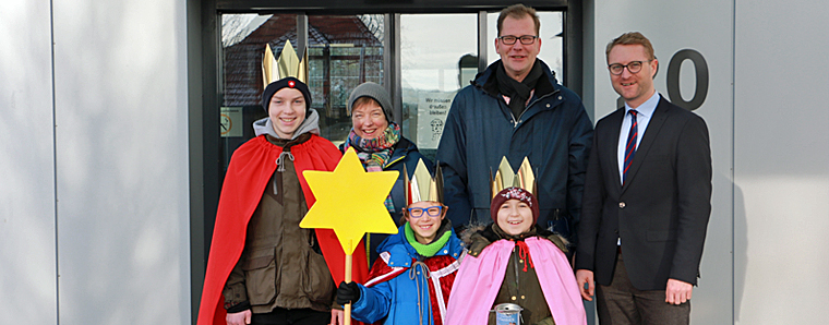 Die Sternsinger brachten für den Ersten Kreisbeigeordneten Dr. Jens Mischak (rechts) ein Ständchen: „Es ist für uns eine Zeit angekommen, die bringt für uns eine große Gnad: unsern Heiland Jesus Christ, der für uns Mensch geworden ist.“ Auf dem Foto von links: Sternsinger Malte Schimanski, Begleiterin Beate Schimanski, Sternsinger Samuel Schein und Dorothea Mohr, dahinter Begleiter Bernd Staubach. Foto: Gaby Richter