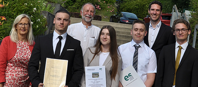 Anke Bischof (Abteilungsleiterin), David Dittmann, Dr. Rudolph Drexler (Vorsitzender des Fördervereins), Jule Hillmeier, David Adamczyk, Dr. Tobias Schuster (Firma Merck, ehemaliger CTA, Festredner), Manuel Janzen. Foto: Thimo Maase