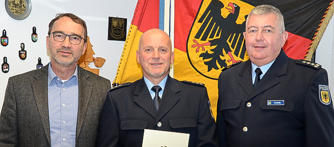Polizeihauptkommissar Thomas Reith, Sachbearbeiter im Stabsbereich Einsatz der Bundespolizeiabteilung Hünfeld, konnte jetzt sein 40-jähriges Dienstjubiläum begehen. In Vertretung des Abteilungsführers überreichte Erster Polizeihauptkommissar Stefan Czeloth dem Jubilar die Dankurkunde des Bundesministers des Innern und dankte Herrn Reith für 40 Jahre Dienst bei der Bundespolizei. Er hob besonders dessen Engagement und die tadellose Dienstauffassung hervor. Die Glückwünsche der Bediensteten überbrachte der Vorsitzende des Personalrates, Polizeihauptkommissar Frank Martini.