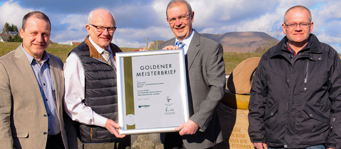 Obermeister Arno Kempf und Geschäftsführer Dietmar Weidenbörner von der Kreishandwerkerschaft Fulda lobten Dieter Macks Einsatz für das Handwerk und überreichten ihm den Goldenen Meisterbrief der Handwerkskammer Kassel. +++ fuldainfo