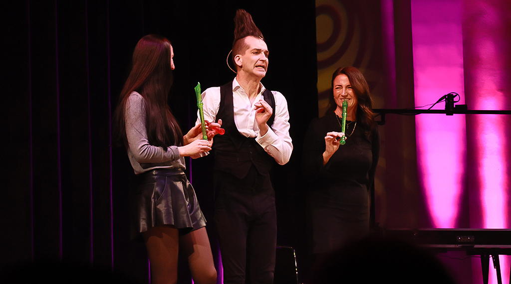 Mit Spannung und Hingabe verfolgte das Publikum ebenso die artistische Darbietung der schwedischen Handstand-Equilibristin Cecilia Hedlund, die auf einer meterhohen Stuhlkonstruktion ihr Können performte, womit sie an Marina Skulditskaya aus der Show „Ananda“ aus dem Jahr 2023 erinnerte. Für herzhaftes Lachen und zugleich Staunen beim gestrigen Wintervarieté sorgte außerdem der ungarische Musiker und Comedian Gabor Vosteen, der sich mit seiner vielseitigen artistischen Darbietung auf der Blockflöte einen Namen gemacht hat und unter anderem Beethovens Ode an die Freude (Freude, schöner Götterfunken) auf sehr spezielle Art performte und später sogar noch einmal ein Dutzend Zuschauer miteinbezog.