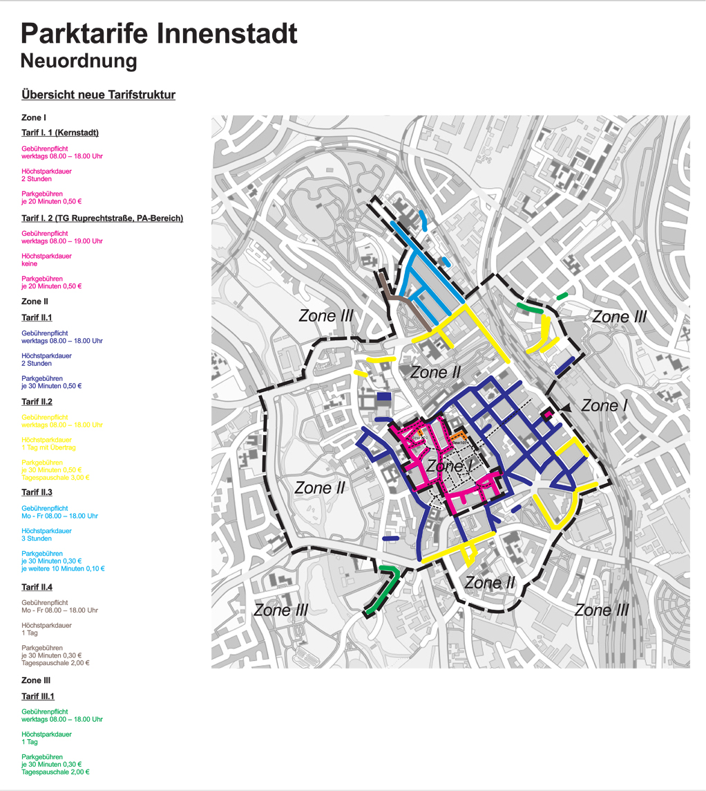 "Wir haben das Stadtgebiet jetzt in drei unterschiedliche Tarifzonen eingeteilt, innerhalb dieser es sechs unterschiedliche Tarife gibt.", so der Bürgermeister weiter. Nicht in allen Zonen werde es, nach Wehner, möglich sein, Tagestickets zu nutzen. Dies ist auch der Tatsache geschuldet, dass man nicht überall Dauerparker haben möchte. Thomas Flügel, Leiter der Abteilung Straßenverkehr und Parken, ergänzte, dass in Parkhäusern grundsätzlich länger geparkt werden sollte; die Parkplätze im öffentlichen Raum sollen für kürzere Zeiten, wie beispielsweise zum Einkaufen oder für Erledigungen, zur Verfügung stehen. Zum Anwohnerparken erklärte Flügel am Beispiel "Frauenberg", dass man immer wieder auch einmal Einzelgespräche führe, wenn ein Anwohner mit einem Parkproblem auf die Stadt zukomme. In diesem Sinne würden dann auch die Anwohner angehalten, dass sie in der Nachbarschaft anfragen, ob es sich um ein Einzelproblem handele oder um ein Problem in der gesamten Straße. Hier versuche die Stadt das Problem immer so zulösen, dass alle mit der Situation leben können.