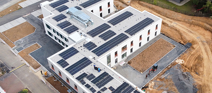 „Die Sonnenstromerzeugung durch Nutzung der Caritas-Dächer hat schon in unserem Verband Tradition“, betont Ansgar Erb, der als Caritas-Vorstandsmitglied für die Durchführung von Baumaßnahmen verantwortlich ist und gemeinsam mit Christof Schneider, Einrichtungsleiter des Jugendhilfeverbunds St. Elisabeth, die Energiespar-Projekte der Caritas entwickelt und durchführt. „Der überwiegende Teil der elektrischen Energie wird übrigens in dem neuen Gebäude sowie in der benachbarten Caritas-Werkstatt genutzt“, erläutert Erb. „So gibt es saubere Energie, und mit Nutzung des preisgünstigen Eigenstroms schont die Caritas auch ihre finanziellen Ressourcen – Geld, das zum Wohle der betreuten Menschen anderer Verwendung zugeführt werden kann.“ Unser Foto entstand vor kurzem und zeigt das Dach des neuen Gebäudekomplexes am Neuenberg mit den Solarmodulen. +++ pm/cs