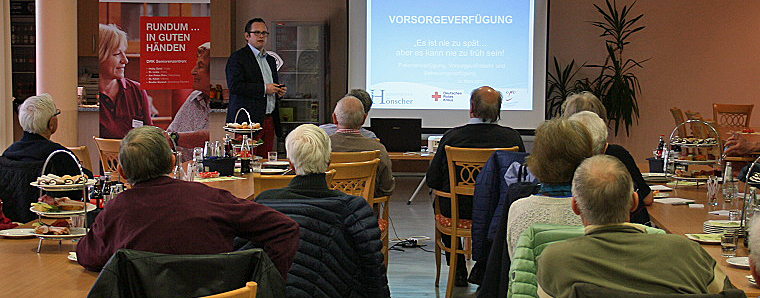 Petersberg. Einen sehr aufschlussreichen und kurzweiligen Abend erlebten die Zuhörer des Vortrages zum Thema „Vorsorgevollmacht – es ist nie zu spät“. Dr. Ralph-Michael Hönscher, langjähriger und geschätzter Kooperationspartner, referierte im DRK-Seniorenzentrum „Am Roten Rain“ in Petersberg lebhaft über dieses wichtige Thema und gab den über 20 Interessierten Aufschluss über die Möglichkeiten und die Notwendigkeit einer Vorsorgevollmacht und Patientenverfügung. Reichliche Fragen konnten in einem offenen Dialog mit den Anwesenden geklärt werden und sorgten dafür, sich mit diesem komplexen Thema vertraut zu machen. Aus erster Hand erfuhren die Zuhörer, wie man frühzeitig und selbstbestimmt Angehörigen oder Freunden die nötige Handlungsfähigkeit überträgt. Nach dem Vortrag war Zeit für eine Diskussionsrunde, bei einem kleinen Imbiss. +++