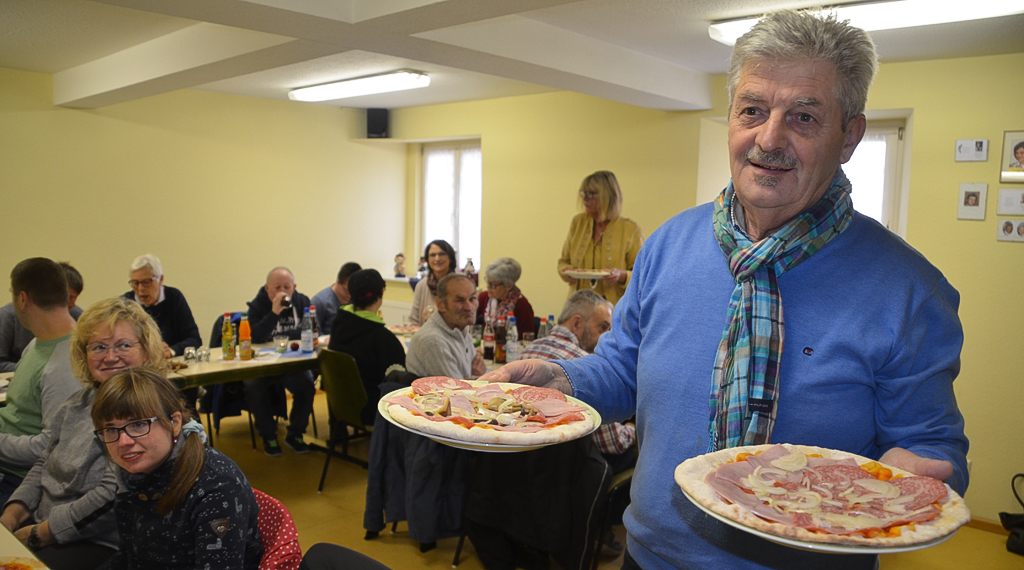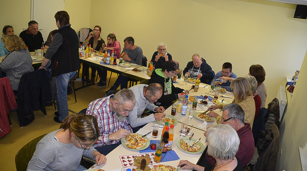 Mit einer Orchidee richtete Walter Bernhard einen besonderen Dank an die langjährige Betreuerin Brunhilde Müller und er gratulierte ihr gleichzeitig nachträglich zu ihrem 70. Geburtstag. Ebenfalls gratulierte Walter Bernhard mit kleinen Geschenken denjenigen Gruppenmitgliedern, die in den letzten Monaten ihren Ehrentag feiern konnten. Nach der kleinen Dankeszeremonie sangen die Gruppenmitglieder gemeinsam das bekannte Kreuzberglied und sie schunkelnden freudestrahlend unter den Hymnen des gern gesungenen Rhön-Lied. Bei den Dankesworten und den Gratulationen kamen deutlich zum Ausdruck, dass sich Gruppensprecher Walter Bernhard mit viel Herzblut und Menschlichkeit um die Belange der Gruppe kümmert. Klaus Donat und das Team fleißige Team der Eichenzeller Backgemeinschaft zeigten sich über die motivierte DRK-Gruppe begeistert und freuten sich, das die Gruppenmitglieder sich sichtlich beim gemeinsamen Pizzaessen wohlfühlten. Die Dankbarkeit und Freude der behinderten Menschen war auch bei diesem Monatstreffen wieder zu spüren und für die Gruppenmitglieder sind die seit vielen Jahren durchgeführten und schon traditionellen Monatstreffen immer ein schöner Ausgleich zum Alltag. Die Monatstreffen sind stets von einer ganz besonderen Stimmung geprägt und es ist beeindruckend wie gut die Inklusion bei der Eichenzeller DRK-Gruppe funktioniert und intensiv gelebt wird. Bereits seit über 40 Jahren trifft sich die Gruppe des DRK-Eichenzell einmal im Monat an einem Samstagnachmittag.
