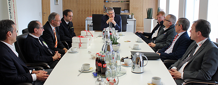 Die Vertreter der beauftragten Rettungsdienstleister im Gespräch – alle sind guter Dinge, dass die Zusammenarbeit im Sinne der Bevölkerung bestens gelingen wird (v. l.): Siegfried Simon (Amtsleiter für Aufsichts- und Ordnungsangelegenheiten), Dr. Erich Wranze-Bielefeld (Ärztlicher Leiter Rettungsdienst), Marco Schulte-Lünzum (Regionalvorstand Johanniter Mittelhessen), Dr. Sven Holland (Kreisbrandinspektor), Landrat Manfred Görig, Jürgen Schad (Sachbearbeiter Rettungsdienst), Markus Müller (Geschäftsführer DRK Mittelhessen), Alfred Horn (Aufsichtsratsvorsitzender DRK Mittelhessen) und Ralf Dickel (Prokurist DRK Mittelhessen).