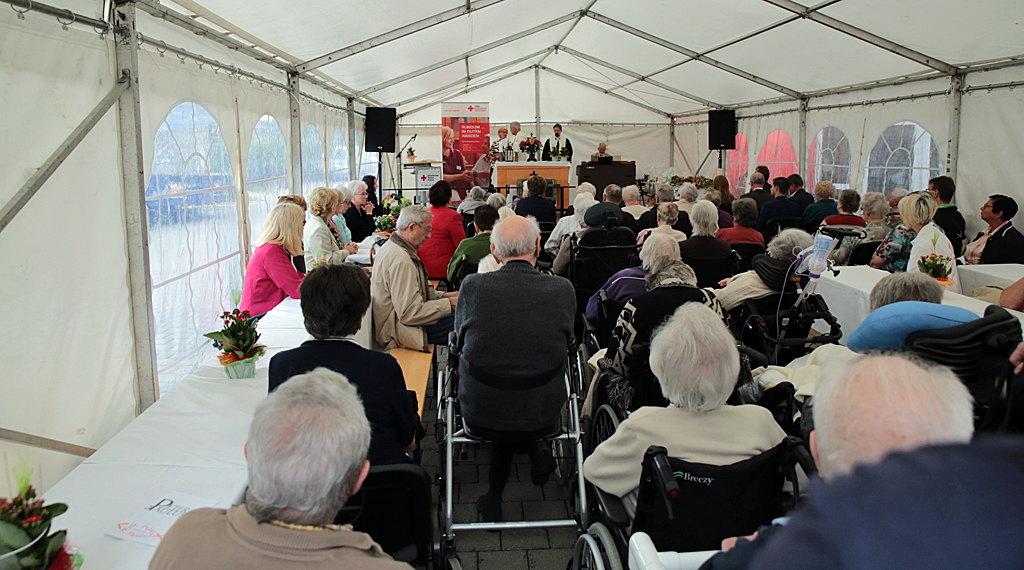 Christoph Schwab (Vorstandsvorsitzender des DRK-Kreisverbandes Fulda e. V.), Markus Otto (Geschäftsbereichsleiter Senioren) und Sandra Meraner (Einrichtungsleiterin des Seniorenzentrums „Am Roten Rain“) mit den Jubilaren auf dem Außengelände der Senioreneinrichtung. Im Festzelt Pavillon auf der Außenanlage des Seniorenzentrums erinnerten Pfarrer Jan Kremer von der Katholischen Kirchengemeinde Petersberg „St. Peter“ und Pfarrer Christian Pfeifer von der Evangelischen Kirchengemeinde Petersberg im ökumenischen Gottesdienst zu Beginn des Jubiläumsfestaktes an die „zwischenmenschliche Besonderheit“ in der Senioreneinrichtung. Dabei gingen sie auch auf die Besonderheit ein, die jeder Einzelne der 64 Bewohner der Einrichtung in zwischenmenschlichen Begegnungen sowie im Herzen in sich trage. Bildlich und für alle Anwesenden sichtbar wurden diese Ausführungen in Anlehnung an die christliche Nächstenliebe im gesprochenen Wort von Gerlinde Leibold, der Seniorenseelsorgerin der Senioreneinrichtung.
