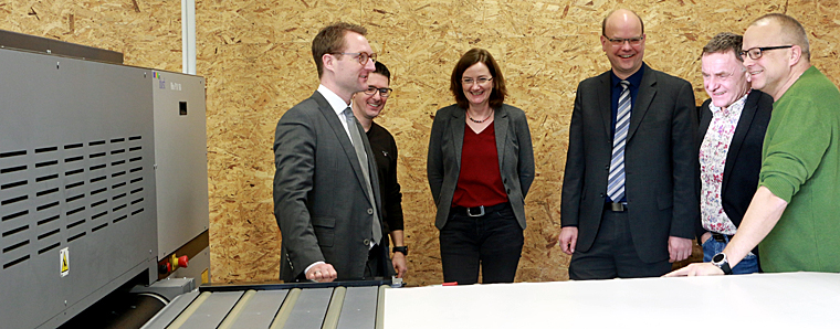 An der Druckmaschine, dem Herzstück der Firma evds (v. l.): Wirtschaftsdezernent Dr. Jens Mischak, Lars Rothe (Geschäftsführer), Andrea Ortstadt (Wirtschaftsförderung Vogelsbergkreis), Bürgermeister Dr. Olaf Dahlmann, Thomas Schaumberg (Vogelsberg Consult GmbH) und Hartmut Beck (Geschäftsführer). Fotos: Gaby Richter