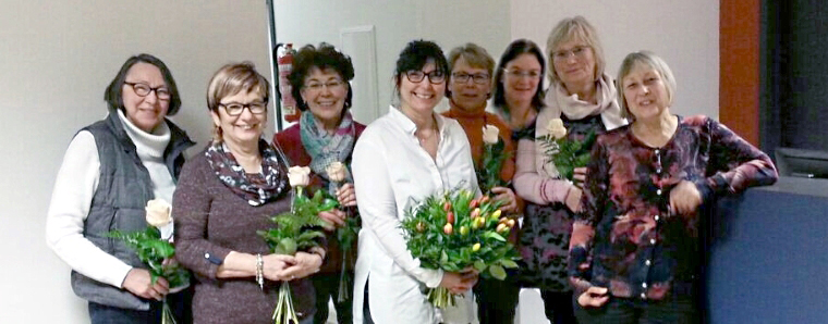 Dank an die Familienpatinnen (von links): Gisela Carstensen-Harnack, Marianne Zimmer, Ingrid Bloch, Hiltrud Hansel, Gabi Arendt, Anett Wunderlich (4. v. l., Familienservice) Henriette Pfeffer-Wiegand (6. v. l., Ehrenamtskoordinatorin Caritas), Dagmar Stabenow-Kräuter (rechts, Caritas). Foto: Henriette Pfeffer-Wiegand