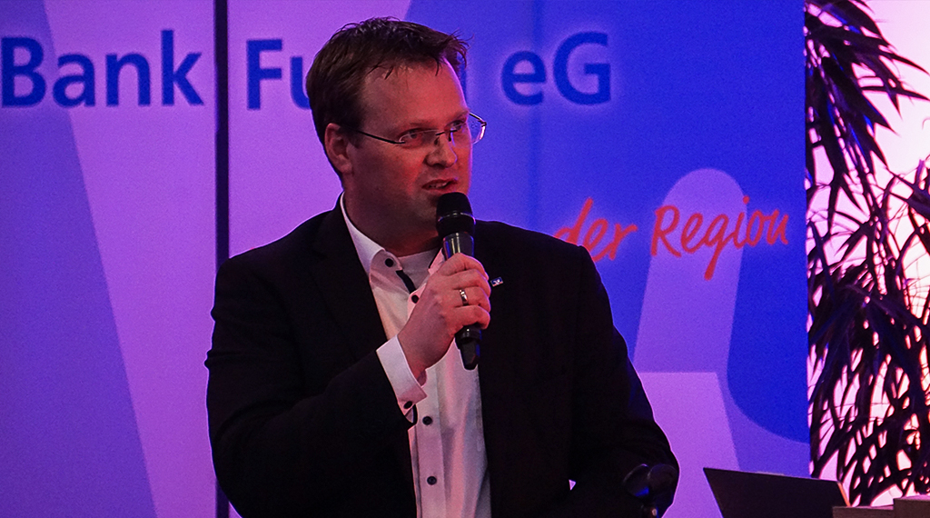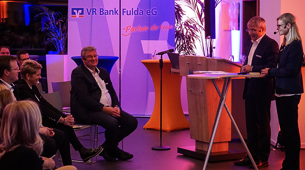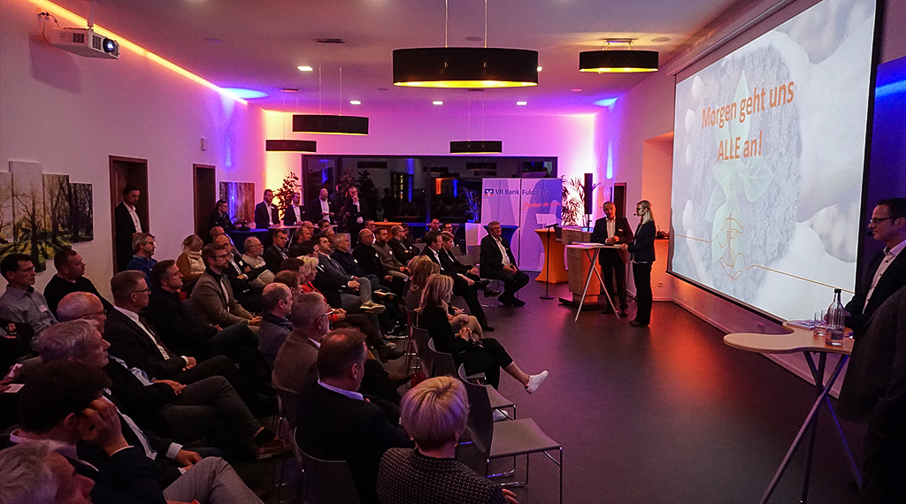 Einen weiteren Punkt auf der Agenda des Abends lieferte die VR Bank Fulda selbst. Nadine Rausch, Leiterin Personalentwicklung, und Torsten Hopf, der das Vorstandstrio mit Thomas Sälzer und Frank Mackenroth bildet, referierten zum Thema „Morgen geht uns alle an - Nachhaltigkeit bei der VR Bank Fulda". „Nachhaltigkeit ist einer der Megatrends. Diese entwickeln sich zwar langsam, sind aber enorm wichtig. Sie wirken auf alle Ebenen der Gesellschaft und beeinflussen Unternehmen, Institutionen, Individuen - und damit uns alle", sagte Rausch. Und Hopf fügte an: „Megatrends sind daher auch Grundlage für Entscheidungen in Wirtschaft, Politik sowie auf persönlicher Ebene." Nachhaltigkeit zähle zum Megatrend Neo-Ökologie und sei damit eine Gemeinschaftsaufgabe.