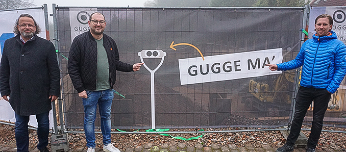 Das sogenannte „Gugge-Haus“ in der Fuldaer Straße in Eichenzell wurde abgerissen. Die Investoren Patrick Bohl und Sebastian Wess errichten dort das „Gugge-Viertel“ und wollen damit den Ortskern beleben. In zwei Gebäuden sind Bar, Restaurant, Gewerbeflächen und 13 Wohneinheiten mit insgesamt 1000 Quadratmetern Wohnfläche geplant. Die Wohneinheiten sind von 35 bis knapp 100 Quadratmeter groß. Heute wurde offiziell der Grundstein dazu gelegt. Die Investoren freuen sich gemeinsam mit Bürgermeister Rothmund, dass es nun endlich losgeht.