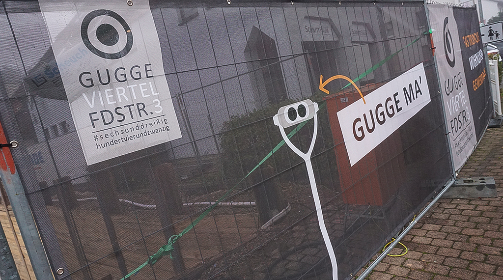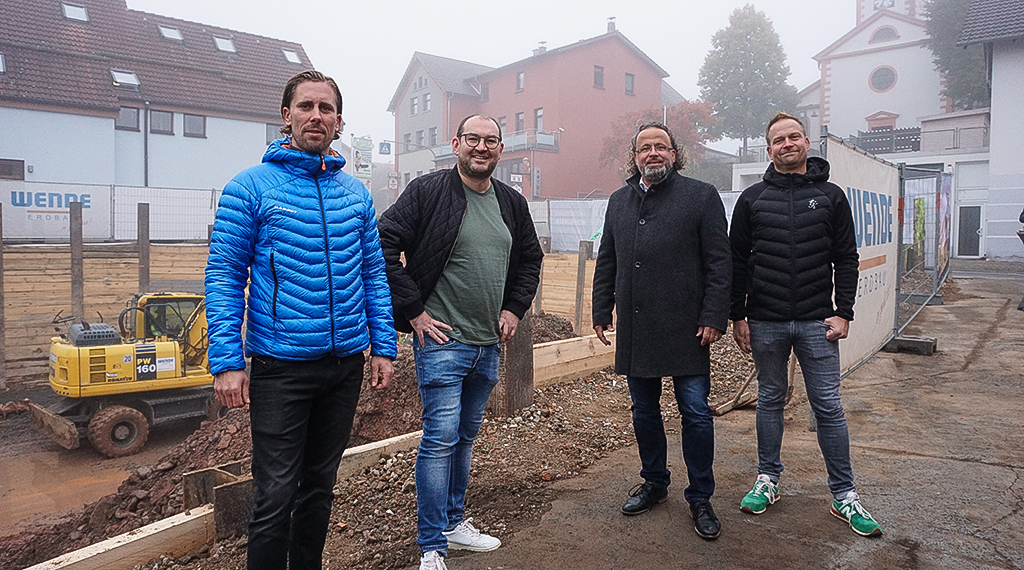 Das sogenannte „Gugge-Haus“ in der Fuldaer Straße in Eichenzell wurde abgerissen. Die Investoren Patrick Bohl und Sebastian Wess errichten dort das „Gugge-Viertel“ und wollen damit den Ortskern beleben. In zwei Gebäuden sind Bar, Restaurant, Gewerbeflächen und 13 Wohneinheiten mit insgesamt 1000 Quadratmetern Wohnfläche geplant. Die Wohneinheiten sind von 35 bis knapp 100 Quadratmeter groß. Heute wurde offiziell der Grundstein dazu gelegt. Die Investoren freuen sich gemeinsam mit Bürgermeister Rothmund, dass es nun endlich losgeht.