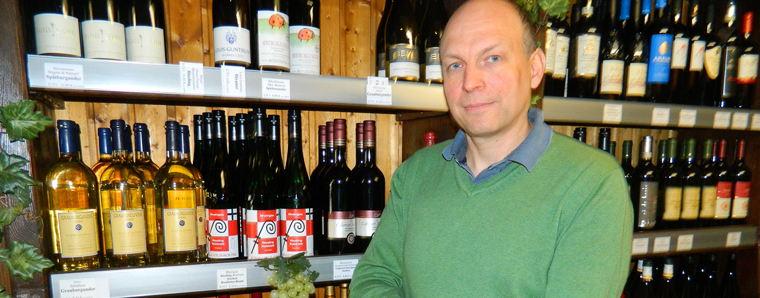 Wenn Eric Pohlmann einen neuen Wein in sein Sortiment aufnimmt, lässt es sich der Inhaber des Weinhauses Jochim nicht nehmen, zunächst den Winzer und seinen Betrieb persönlich kennen zu lernen. So besuchte der 45-Jährige aus dem Schottener Stadtteil Einartshausen auch Uwe Schreiber auf seinem Weingut Johanneshof in Hochheim am Main. In diesem Familienunternehmen entsteht der Bonifatius-Wein von der Lese bis zur Flaschenabfüllung. Die Trauben wachsen an den Rebhängen der „Hochheimer Hölle“, die der Wanderer auf seinem Weg nahe Hochheim durchquert.