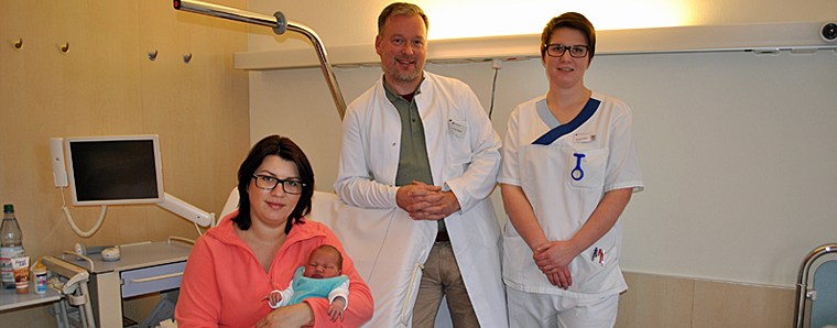 Mutter Irene Postnikov mit Luca, Dr. med. Alexander Dengler, Chefarzt der Abteilung für Gynäkologie und Geburtshilfe im Herz-Jesu-Krankenhaus Fulda, Yvonne Völker, Stationsleiterin auf der Geburtenstation Lioba im Herz-Jesu-Krankenhaus Fulda.