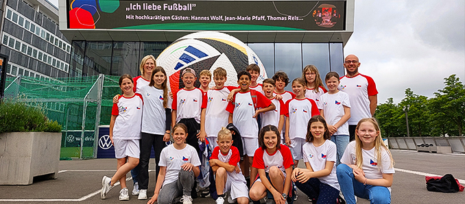Nach der Zulosung europäischer Länder im Dezember 2023 an 150 teilnehmende Schulen aus ganz Deutschland, bekam die Grundschule Haimbach gemeinsam mit fünf weiteren Schulen das Nachbarland Tschechien zugelost. Nun ging es darum, sich kulturell und fußballerisch mit dem Land auseinanderzusetzen und einen Wettbewerbsbeitrag zu erstellen. So ist die Idee zu einem Rap über Tschechien und einem Film dazu entstanden. Am 29.02.2024 wurde der Beitrag in Form eines Videos eingereicht und nach vier spannenden Wochen informierte die Jury in einer Videobotschaft die Klasse 4a über ihren Gewinn: Zwölf Kinder der Klasse dürften als “Team Tschechien“ in Bochum am EUROKiK-Festival teilnehmen. Die Freude war riesengroß! Jeder aktive Teilnehmer erhielt ein eigenes Fußballtrikot und Eltern gestalteten Fanshirts für die restlichen Kinder.