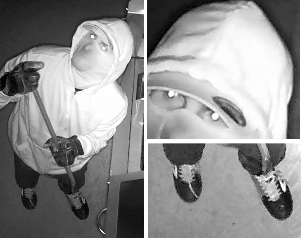 Die Polizei fragt: 1. Wer kann Hinweise zur Identität der auf dem Bild zu sehenden, maskierten Person geben? Markant sind insbesondere die Handschuhe, die Schuhe und das Emblem auf dem Mützenschild.
