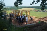 Mit großer Unterstützung von vielen Beteiligten traf vier Wochen vor dem großen Fest die Baugenehmigung ein. Unter großem Zeitdruck erstellten wir in Eigenleistung die Fundamente und mauerten einen Sandsteinsockel. Drei Tage vor dem Fest war es dann soweit, die Lehrlinge begannen bei strahlendem Sonnenschein unter Anleitung von Marcel Ewald mit dem Aufstellen der Kapelle. Mit Feuereifer und handwerklichem Geschick gingen sie ans Werk. Als dann auch das Aufsetzen des doch sehr hohen Türmchens gelungen war, konnte mit dem Einbau der Sparren noch am Nachmittag das Werk vollendet werden. Klassensprecher Brian Harth sprach den traditionellen Richtspruch und die Lehrlinge besiegelten die Vollendung mit einem zünftigen Zimmermannsklatsch.