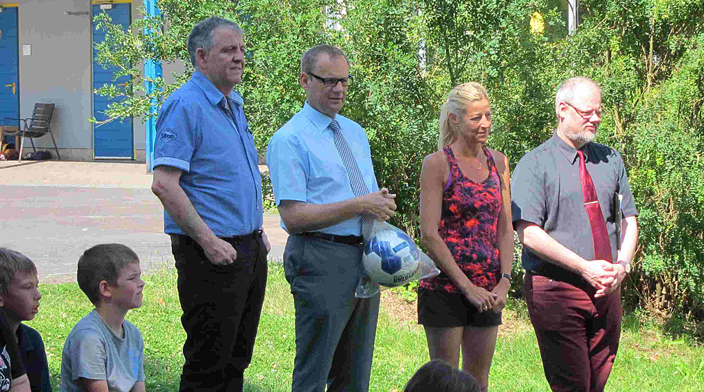 Bei herrlichstem Sommerwetter fanden zudem am Freitag die Bundesjugendspiele statt. Zur Siegerehrung begrüßte die Schulleiterin Frau Martina Fischer den Bürgermeister der Stadt Dag Wehner sowie Stefan Frauenholz, Vorstandsmitglied des TTC Maberzell. Damit der Sport weiterhin im Mittelpunkt des Schulgeschehens stehen kann, überreichte Herr Wehner ein Ballgeschenk an die Schulgemeinde. Schulsieger wurden in diesem Jahr Benedikt Seifert und Nele Büchl (s. Foto mit Dag Wehner). Für die Ehrengäste hatten dann die Schülerinnen und Schüler eine besondere Überraschung vorbereitet, zur Musik „Happy“ hatten sie unter der Leitung von Alexandra Becker einen „Schultanz“ einstudiert. +++ fuldainfo
