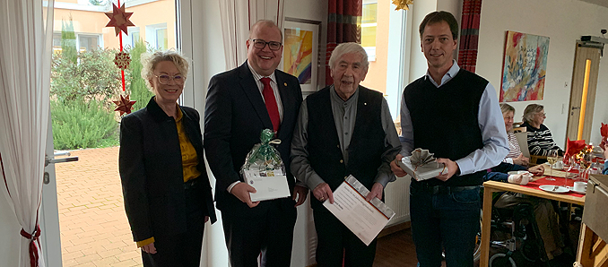Heinz, der als stellvertretender Vorsitzender der Kreis-CDU auch den verhinderten Jens Mischak vertrat, würdigte in einer kurzen Laudatio die Verdienste von Ewald Nolte, der in wenigen Tagen 98 Jahre alt wird. Unter drei Bürgermeistern – Kratz, Lipphardt und Distelmann – war er CDU-Stadtverordneter und zwei Jahre lang auch stellvertretender Stadtverordnetenvorsteher. Für Noltes ehrenamtliches Engagement in der Alsfelder Stadtpolitik bedankte sich Heinz und schloss auch all diejenigen mit ein, die sich in anderen demokratischen Parteien für das Gemeinwohl eingesetzt haben und einsetzen.