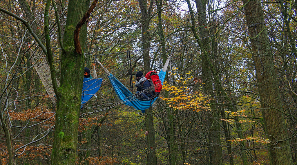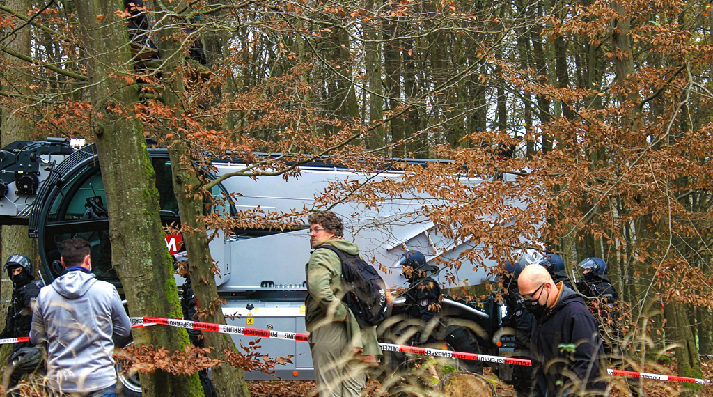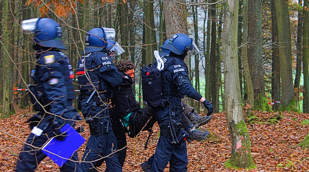 Genau wie gestern begleitete die Polizei heute die Arbeiten zur Errichtung eines Logistikzentrums im südlichen Dannenröder Forst. Der Aufbau dieses Logistiklagers schreitet voran. Vereinzelte in der Nähe befindliche Gebilde, wie Baumhäuser und Hängematten in 2-4 Metern Höhe, waren mit Personen besetzt und wurden geräumt und beseitigt. Einsatzkräfte durchsuchten erneut den nördlichen Teil des Dannenröder Forstes nach Gefahrenquellen. Es wurden dabei zwei neue Tripods entdeckt, die mit jeweils einer Person besetzt waren.