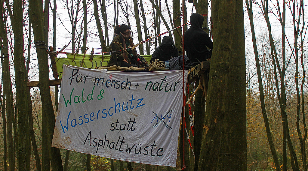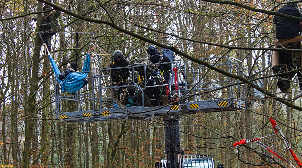 Autobahngegner hatten die Nacht genutzt, um neue Barrikaden zu errichten. Ein Hubsteiger half dabei, die Personen sicher auf den Boden zu bringen. Anschließend beseitigte die Polizei die Hindernisse. Weiterhin fanden im dortigen Bereich schon erste Rodungsarbeiten statt. Es wurden auch Arbeiten durchgeführt, um Waldwege/Rettungswege wieder befahren zu können. Während der Maßnahmen gegen einzelne Ausbaugegner in den Bäumen, kam es unter anderem auch zu einer Widerstandshandlung. Dabei wurde glücklicherweise niemand verletzt, obwohl die Aktion geeignet gewesen wäre, Leib und Leben zu gefährden. So versuchte eine Ausbaugegnerin vor den Augen verschiedener Medienvertreter beim Transport nach unten, vom Hubsteiger aus auf ein Sprungkissen zu springen. Durch das Eingreifen der spezialisierten Einsatzkräfte konnte dies verhindert werden. Im Anschluss leistete die Frau Widerstand und wurde festgenommen. Im Bereich des Camps „Drüben“ wollten gegen 11:15 Uhr drei Personen eine Polizeiabsperrung durchbrechen.