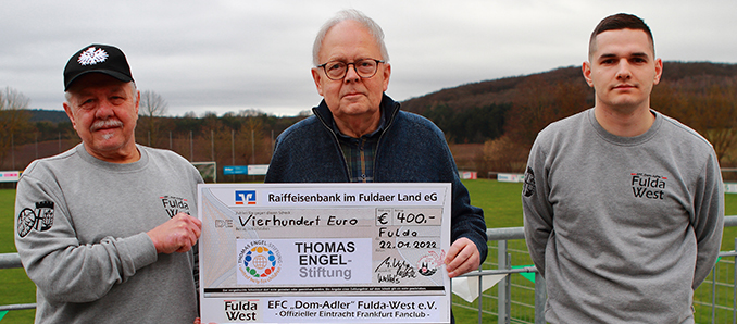 Der Eintracht Fanclub EFC „Dom-Adler“ Fulda-West überreichte der THOMAS ENGEL-Stiftung, vertreten durch den Vorstandsvorsitzenden Ernst Engel, eine Spende in Höhe von 400 Euro. Seit mehr als 12 Jahren unterstützt die THOMAS ENGEL-Stiftung mit Sitz in Fulda-Haimbach in Eswatini, Tansania, Ecuador und Nepal regelmäßig etwa 3.000 Kinder, die aus ärmsten Verhältnissen stammen, mit Nahrung, medizinischer Grundversorgung und Bildung, heißt es in einer Mitteilung. Hinzu kommen individuelle Hilfsmaßnahmen für bedürftige Familien aus dem schwierigen Umfeld der Kinder. So werden beispielsweise in Ecuador behinderte und kranke Kinder bzw. Jugendliche unterrichtet und bis hin zu lebensnotwendigen Operationen medizinisch versorgt. Seit der Gründung in 2018 habe der Eintracht-Fanclub bereits verschiedene Projekte im Bereich der Jugendarbeit und Gemeinnützigkeit unterstützt. „Wir freuen uns, mit der Spende an die THOMAS ENGEL-Stiftung diesmal ein internationales Hilfsprojekt zu unterstützen. Der Begriff Eintracht Frankfurt International wird somit von uns als Fanclub aktiv besetzt“, so der Vorsitzende H.-J. Tritschler. Zudem wisse man, dass das Geld ohne Abzug von Kosten 1:1 direkt in die Projekte vor Ort fließe und wirkungsvoll eingesetzt werde. Das Spendengeld konnte weitgehend durch eine interne T-Shirt-Aktion sowie Spenden der Mitglieder generiert werden, aus der Vereinskasse wurde der Betrag dann nochmal aufgerundet. Vorstandsvorsitzender Ernst Engel bedankte sich für die Spende. „Als langjähriges Mitglied der Eintracht und selbstverständlich auch der „Dom-Adler“ Fulda-West freue ich mich ganz besonders über diese Spende“, so Ernst Engel. +++ pm