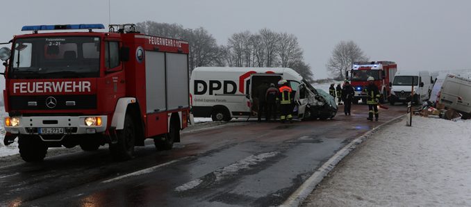 Freiensteinau. Nach einem Eisregen kam es auf der Landesstraße zwischen den Freiensteinauer Gemeindeteilen Ober-Moos und Gunzennau zu einem schweren Verkehrsunfall. Zwei Kleintransporter von Paketdiensten prallten auf gerader Strecke frontal zusammen, drei Menschen wurden in den Unfallwracks schwer verletzt eingeklemmt. Die Feuerwehren Freiensteinau und Grebenhain sowie mehrere Rettungsteams und Notärzte eilten zur Unfallstelle. Rettungshubschrauber konnten den Unfallort aufgrund der Wetterlage nicht anfliegen, die Rettungskräfte am Boden rollten teilweise mit Schneeketten an. Die Feuerwehrleute benutzten zur Rettung der Verunfallten schweres Gerät. „Es mussten auch hydraulische Rettungsgeräte eingesetzt werden“, so Gemeindebrandinspektor Gunter Karl. Eine Streife der Polizeistation Lauterbach nahm vor Ort die Ermittlungen zum genauen Unfallhergang auf, der noch unklar ist. Den entstandenen Sachschaden konnten die Beamten vor Ort noch nicht beziffern. Die Landesstraße war während den Rettungsarbeiten und der Bergung rund zwei Stunden voll gesperrt. +++ fuldainfo | pw