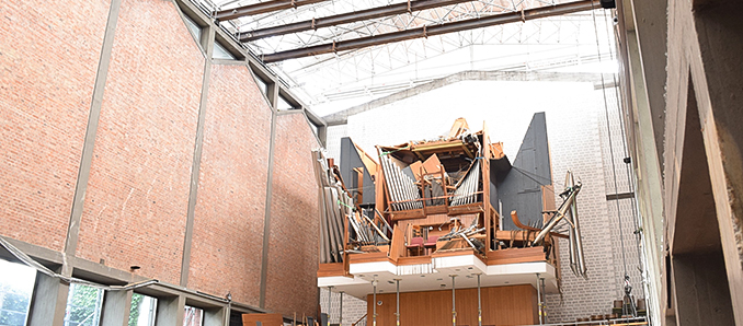 Auch wenn die Dachtrümmer mittlerweile aus dem Kirchenschiff geborgen sind, ist die Elisabethkirche weiterhin eine Baustelle. Ein Gerüst rund um die Kirche trägt ein Notdach, das den Innenraum und die beschädigte Orgel vor weiteren Witterungseinflüssen schützt. Aktuell laufen Überlegungen, dieses Notdach durch ein festeres Provisorium zu ersetzen, unter dem der Kirchenraum vorerst wieder genutzt werden kann, erklärt Diözesanbaumeister Martin Matl.