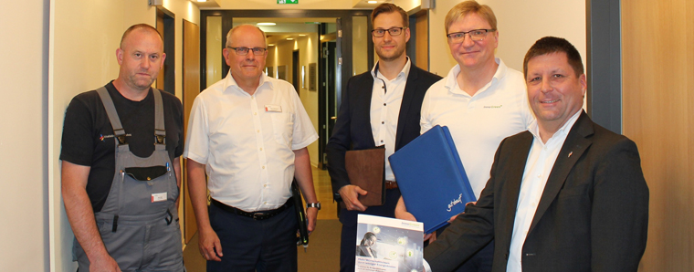 Udo Riedl (Haustechnik) und Geschäftsführer Klaus Schnettger von der Vitalisklinik, Tim Rosar (Geschäftsführer Geschäftsführer InnoGreen Holding GmbH), Elektromeister Jochen Grüning (Projektmanager InnoGreen) und Bürgermeister Thomas Fehling in einem der neu gestalteten Bereiche.