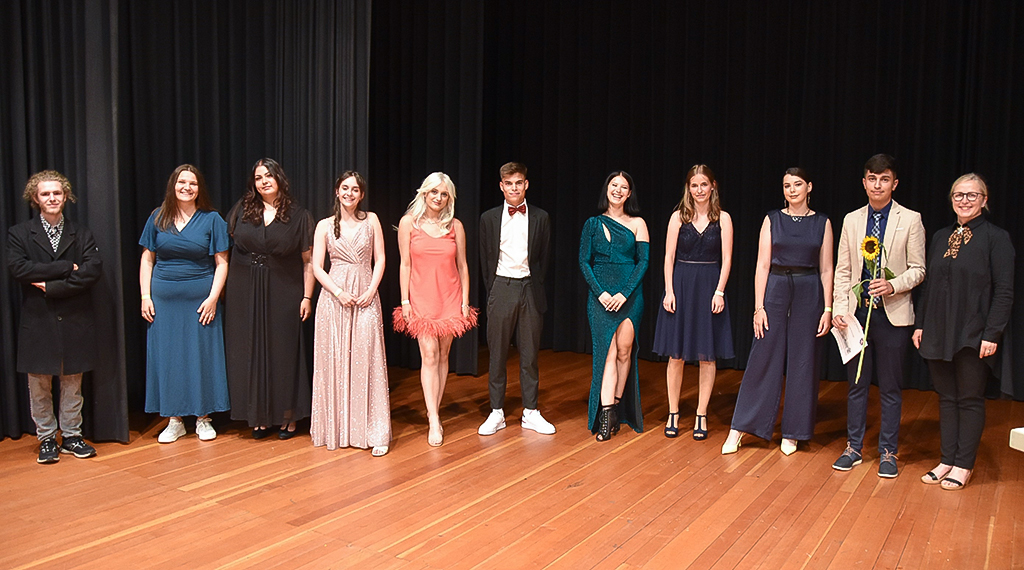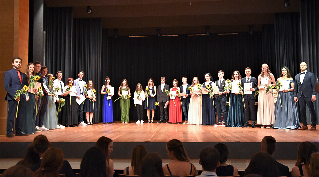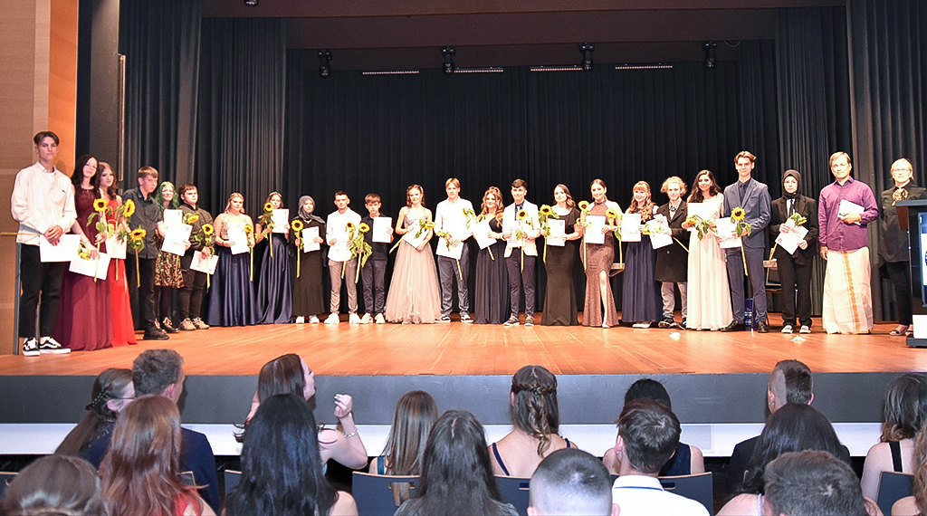 Nachdem die aktuellen und früheren Klassenleitungen sowie die scheidenden Klassenelternbeiräte kleine Präsente erhalten hatten, wurde das ehrenamtliche Engagement der Absolventen gewürdigt: Schulsanitätsdienst, Hilfe in Kantine und Cafeteria, Schulbuslotsen und SV-Arbeit zählen zu den Aufgabenfeldern, die neben dem Schulalltag vorbildlich bewältigt wurden. Für die musikalische Umrahmung sorgten Sarah Bug, Sevilay Kuzu und Maximilian Rovensky mit teils spektakulären Gesangsdarbietungen, begleitet und arrangiert von Musiklehrer Christoph Müller.