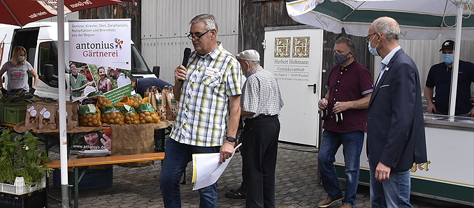 Das die Freude über den 1. Feierabend-Regionalmarkt im Landkreis Fulda groß war, war aus der Begrüßung von Matthias Weller vom Verein Rasdorfer GenussKultur, der das Markttreiben veranstaltete, herauszuhören. Gute regional hergestellte Lebensmittel seien eine „Win Win-Situation“. Sie zu präsentieren und zu verkaufen sei Ziel des Marktes. Er dankte den Anbieter Rohmilch-Käse Tobias Ritz, Setzelbach, Honig-Imker Josef Zechmeister, Rasdorf, Forellen Fischereiverein Rasdorf, Landgasthof Adler, Rasdorf, Weinhandel Schneider, Rasdorf, Fitness-Bäckerei Pappert, Rasdorf, Fleischspezialitäten Landmetzgerei Budenz, Rasdorf und Geflügelhof Zintl, Leibolz, Lammspezialitäten Elmar Spies, Leimbach, Ziegenkäse Johannes Brauer, Schenklengsfeld, Bio-Öle Marion Heilemann, Hofaschenbach, mediterrane Spezialitäten Pamir und Saadat, Friedewald, Bio-Gemüse antonius-Hof, Fulda sowie Getränke Herbert Hohmann, Rasdorf. Die neue Idee mit dem Markt an der Via Regia (B 84) sei wichtig, so Bürgermeister Jürgen Hahn in seinem Dank an den Verein GenussKultur. Er zeige, dass die Förderung regionaler Produktion von Lebensmittel wichtig sei.