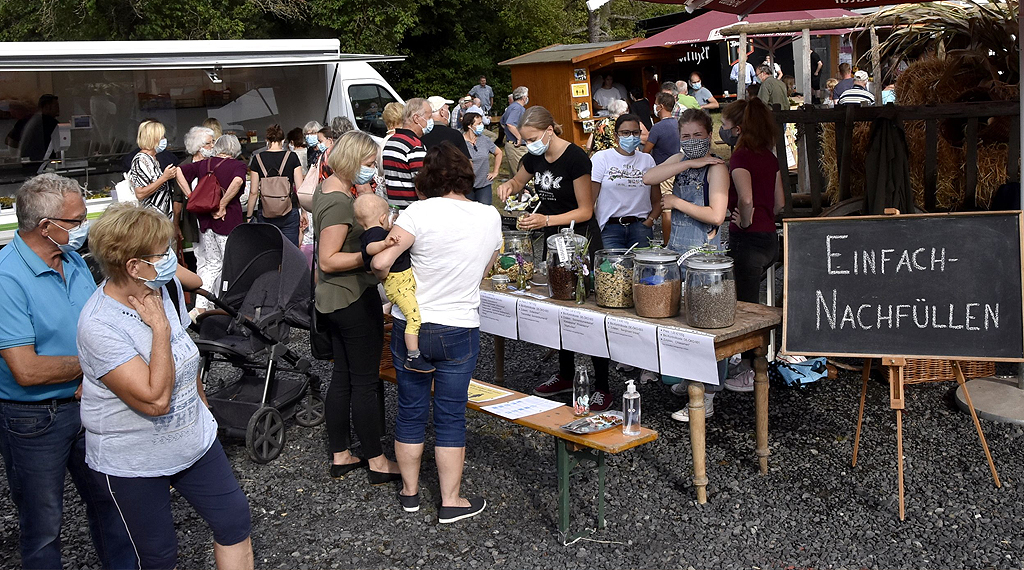 Highlights waren der „Unverpackt Stand“, den Marina Jansohn aus Grüsselbach aufgebaut hatte. Mit ihren Freundinnen Cäcilia Priller, Lilly Hohmann und Johanna Iszleib boten sie beispielsweise Nüsse, Linsen und Rosinen an. Und für alle, die kein Gefäß mitgebracht hatten, hatten sie extra Gläser bereitgestellt. Zudem warben sie mit kleinen Geschmacksproben. Auch die Butterherstellung wie in früheren Zeiten fand Anklang. Christine und Oliver Zopf, Sandra Vogt, Silvia Michel und Gudrun Mende stellten aus 33-prozentiger Sahne nicht nur „normale“ Butter her. So gab es Chili-Knoblauch-, Purpurcurry-, Pfeffer und Bonifatiuskräuter-Butter. Ein drittes war „Bold´s Schnapsideen“. Die im bayrischen Neuwirtshaus ansässigen Brenner Ingrid und Lothar Bold erklärten, wie sie aus Vogelbeeren, Waldhimbeeren oder Renekloden Edelbrände herstellen, die oft mehr als ein Jahr lagern, bevor sie in den Verkauf kommen. Bei dem heißen Wetter schmeckte auch das Eis gut, das auf Schucherts Bauernhof im thüringischen Brunnhartshausen-Steinberg aus eigener Milch hergestellt wird. Für alle zum Verzehr angebotenen Waren und Getränke waren außerhalb des Marktgeländes Sitzplätze ausgewiesen worden.