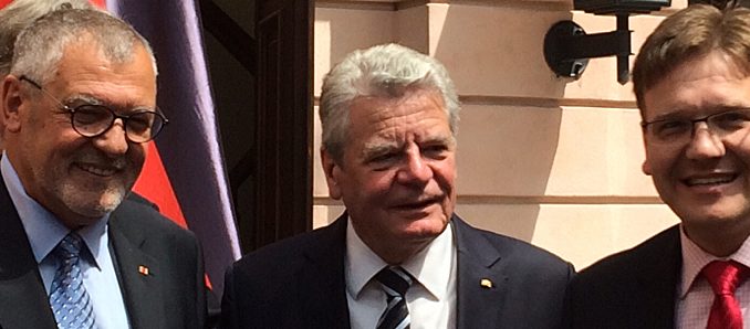 Bei der Gedenkstunde kamen dann noch zwei Frauen unterschiedlicher Generationen zu Wort, Asma Abubaker Ali, aus Somalia geflüchtet, und die Autorin Dr. Edith Kiesewetter-Giese, Vertriebene aus dem Sudetenland zu Wort und schilderten sehr anschaulich ihre grausamen Erlebnisse bei ihrer durchgemachten Flucht und Vertreibung. Dem Präsident des Bundes der Vertriebenen, Dr. Bernd Fabritius, gebührte das Schlusswort bei dieser sehr würdigen Gedenkveranstaltung. Er verband damit eine „Ansage gegen Kollektivschuld und Rechtfertigungstheorien“ und merkte an: “Dieser Gedenktag war Deutschland den eigenen Opfern schuldig“. Stimmungsvoll musikalisch umrahmt wurde die Gedenkstunde vom Deutsch-Polnischen Jugendorchester der Musikschule Frankfurt (Oder). Bei dem anschließenden Stehempfang im Schlüterhof kam es dann noch zu interessanten Begegnungen und Gesprächen zwischen den Teilnehmern, so u.a. auch zwischen dem hessischen BdV-Landesvorsitzenden Siegbert Ortmann und Bundespräsident Dr. Joachim Gauck und der Autorin Dr. Edith Kiesewetter-Giese, die im Jahre 1935 in Neutitschin/Sudetenland geboren wurde. +++ fuldainfo