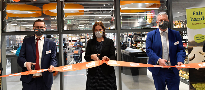 Peter Meindl (Filialgeschäftsführer tegut… München), Verena Dietl (Dritte Bürgermeisterin Stadt München), Bernd Lohmann (Geschäftsleiter Vertrieb Supermärkte) (v.l.) Foto: tegut/Marcus Schlaf