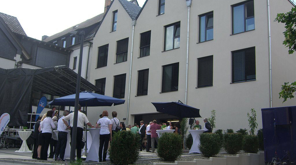 Die Rückseite mit einigen neu geschaffenen Parkplätzen, die am Freitag zur Einweihungsfeier des Erweiterungsbaues eine besondere Atmosphäre geboten hatte.