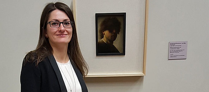 Preisträgerin Eva-Maria König vor einem rekonstruierten Bode-Rahmen (mit Selbstporträt Rembrandt) in der aktuellen Ausstellung im Schloss.