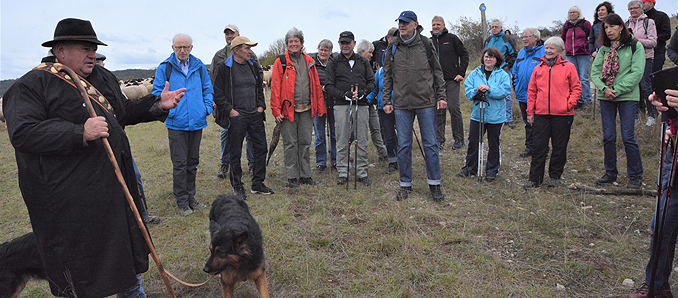 Unter Führung von Stephanie Richter vom Rhönklub Hünfeld/Nüsttal nahm die Teilnehmer dann für die 10,6 Kilomater lange Strecke auf. Sie führt zunächst über Teile des Bienenlehrpfades, wo Torsten Raab über die Bedeutung der Bienenhaltung für Natur und Landschaft berichtete, durch eine abwechslungsreiche Heckenlandschaft in die Haselaue. Von dort aus führt der Weg vorbei an der Großenbacher Kirche mit ihrem historischen Pfarrhof hinauf zum Aussichtspunkt Via Regia. Dieser Turm, so haben auch die Prüfer anerkennend vermerkt, bietet einen imposanten Landschaftsblick und mit dem Fernrohr, in das die Namen von Orten und Bergen eingespiegelt werden, zahlreiche Besonderheiten. Entlang des Höhenzuges des Weinbergs wurden die Wanderer dann durch Schäfer Elmar Spies mit seiner Herde von 450 Schafen und 80 Ziegen in Empfang genommen. Spies berichtete dabei über die Bedeutung der Beweidung dieser Flächen. Durch die Tiere werde die Landschaft dort offen gehalten und seltene Orchideenarten, Insekten und Vögel, könnten sich ansiedeln. Eindrucksvoll demonstrierte Spies auch den Einsatz seiner Hunde, um die Herde beieinander zu halten. Weiter ging es über den Höhenzug des Weinberges Richtung Landkrankenhauswald und von da aus unterhalb der Kernzone des Naturschutzgebietes Weinberg über den Taubenberg und den Bomberg zurück zum Haselsee.